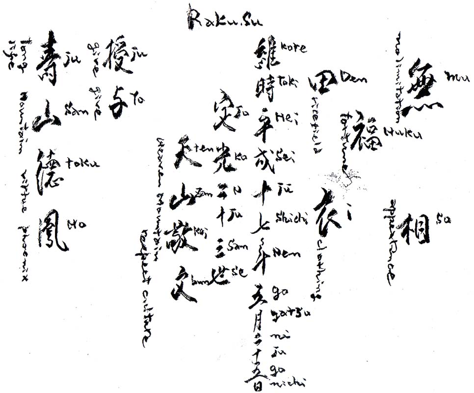 Also Dedicating "Jakkoan Zendo" (Calligraphy by Hojosama Keibun Otogawa) Conducted May 29, 2005 by Michael Newhall, Resident Teacher, Jikoji, Los Gatos, CA USA Rakasu, and Calligraphy with Translations, generously provided by Hojosama Keibun Otogawa, Jokoji, Kamo-shi, Niigata-ken, Japan |